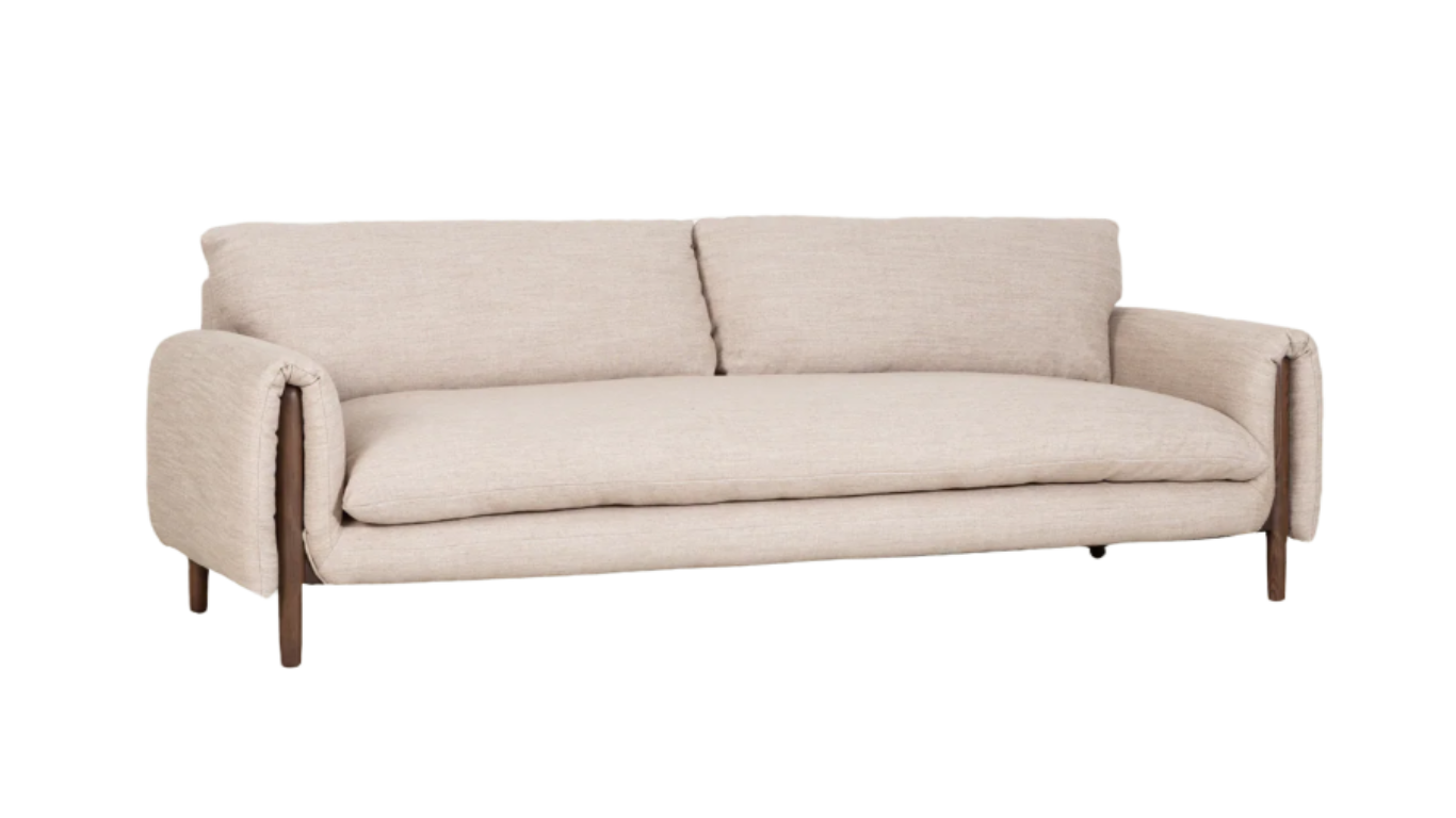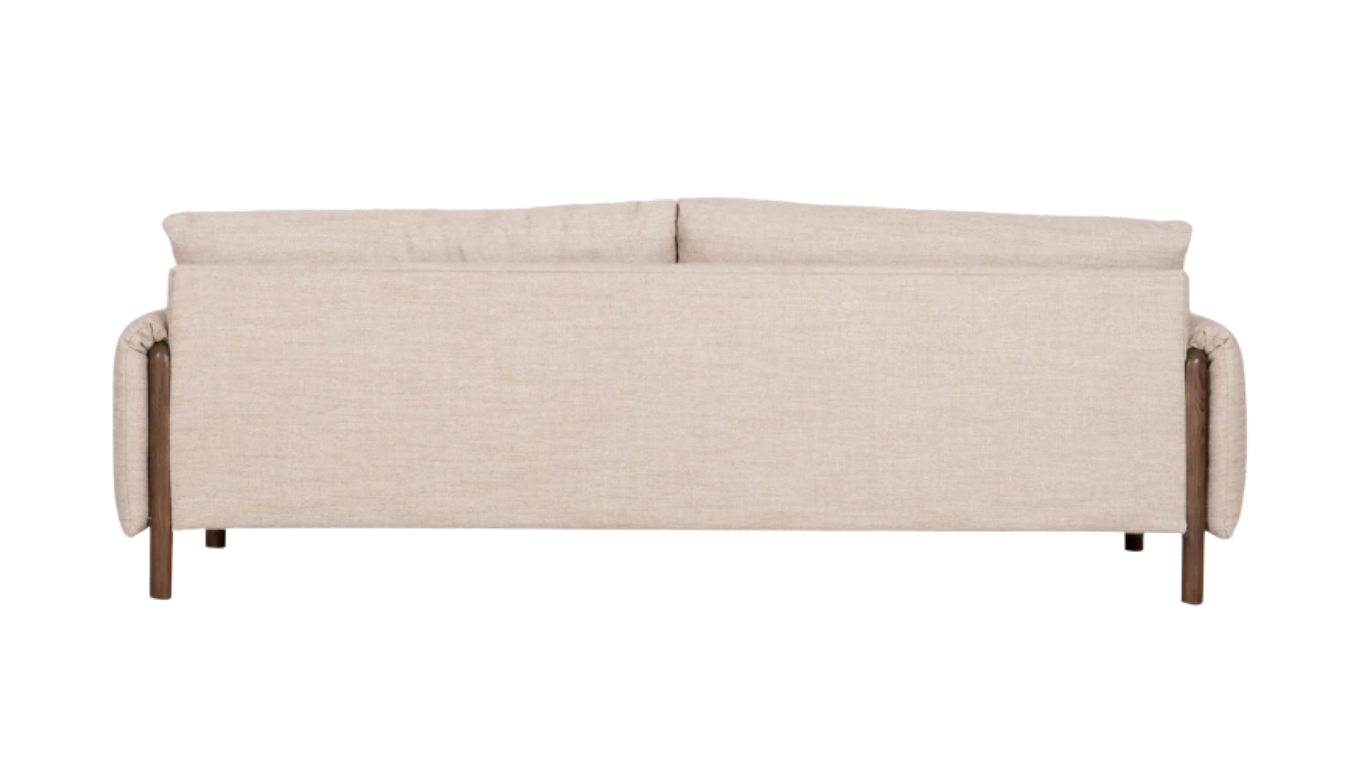 The Lora Sofa effortlessly combines casual ease with modern aesthetics, showcasing a delicate interplay of texture and understated elegance. Featuring wide, folded wrap arms, its expansive bench seat gracefully spans the frame, cascading over a sleek dark ash wood base. Upholstered in a soft poly/linen blend, it offers a subtle texture that enhances its relaxed appearance and inviting feel.